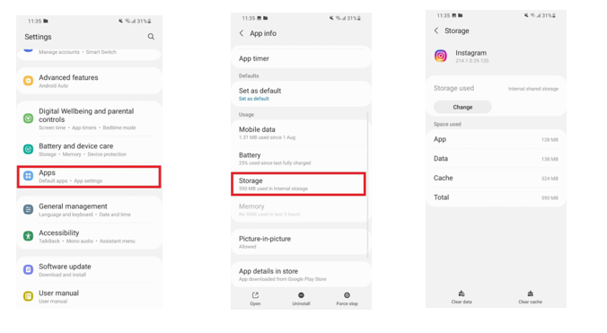 یکی از عوامل اصلی که باعث و علت سیاهی صفحه اینستا می شود ، کش برنامه اینستاگرام است که باید از طریقی که در ادامه ذکر می شود آنرا پاک کنید.