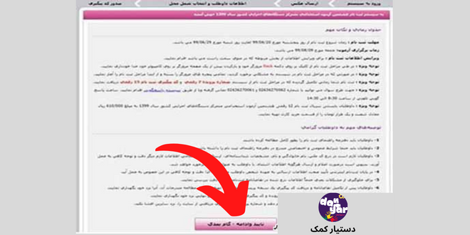 مرحله 4: در این مرحله پس از انتخاب گزینه ثبت نام آزمون وارد صفحه ای می شویم که بعد از خواندن توصیه های مهم به داوطلبان باید بر روی گزینه تایید و ادامه کلیک کنیم.
