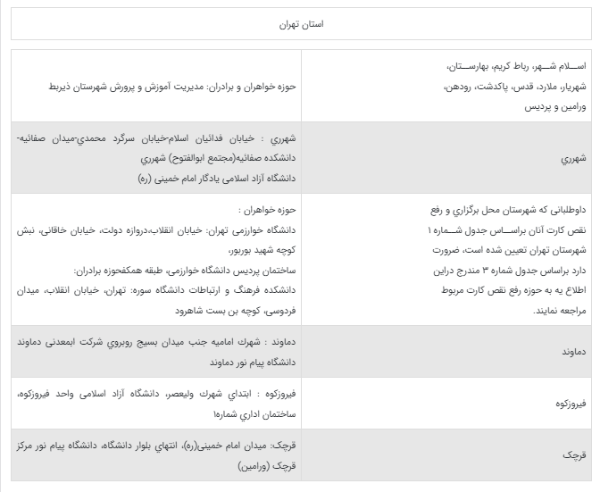 جدول زیر آدرس باجه های رفع نقص، استان تهران برای آزمون پیشین می باشد.