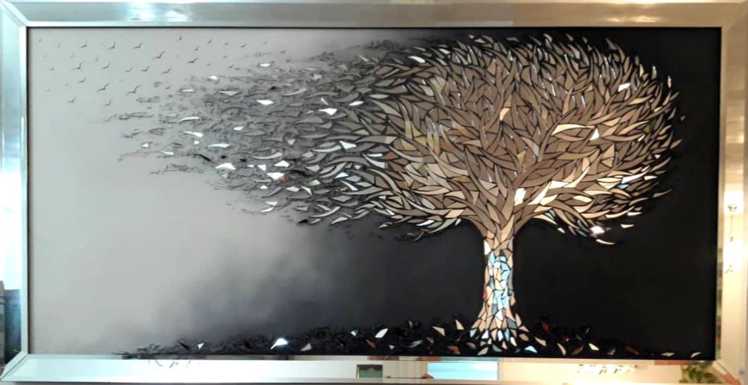 تکه های شکسته آیینه که به صورت سه بعدی و با الگوهای مختلف به یکدیگر متصل شده اند. این نوع تابلو، به دلیل شکل سه بعدی و الگوی خاصی که دارد، در دکوراسیون داخلی فضاهای مختلفی مانند؛ منازل، هتلها، رستورانها و فضاهای تجاری استفاده میشود.